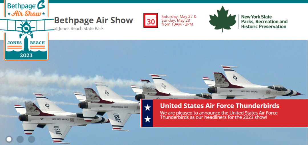 阵亡将士纪念日假期最重要的活动之一: 纽约最大的海滩飞行表演 ——琼斯海滩的 免费飞行表演 又回来了!就在这个周六和周日(5月27日至5月28日)上午10点至下午3点!将会有雷鸟、跳伞等等!大家记得早点出发,因为停车要排很长的队哦~